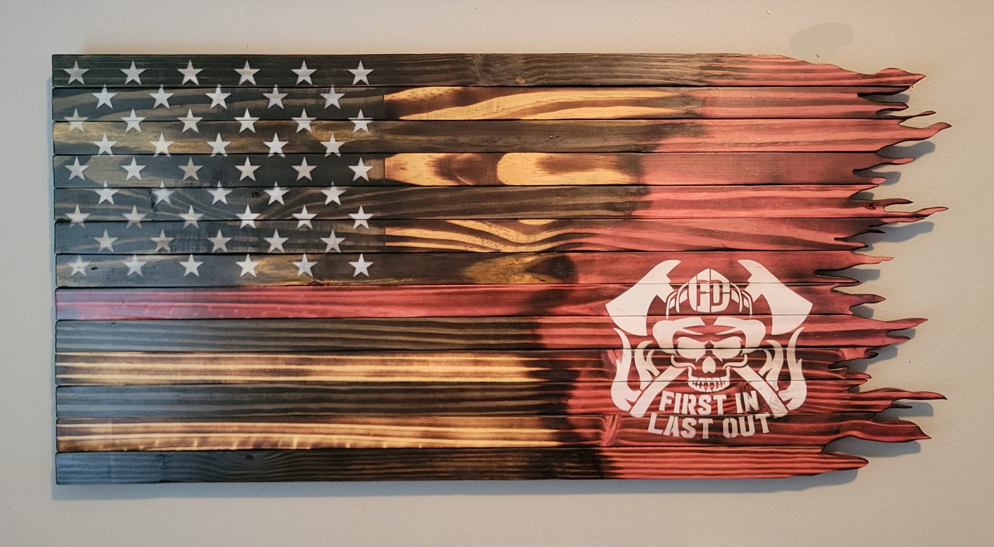 Firefighter "First In Last Out" Wooden American Flag with Jagged Edge